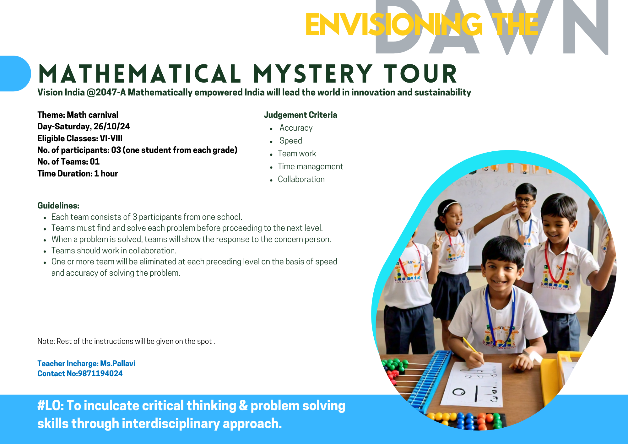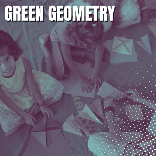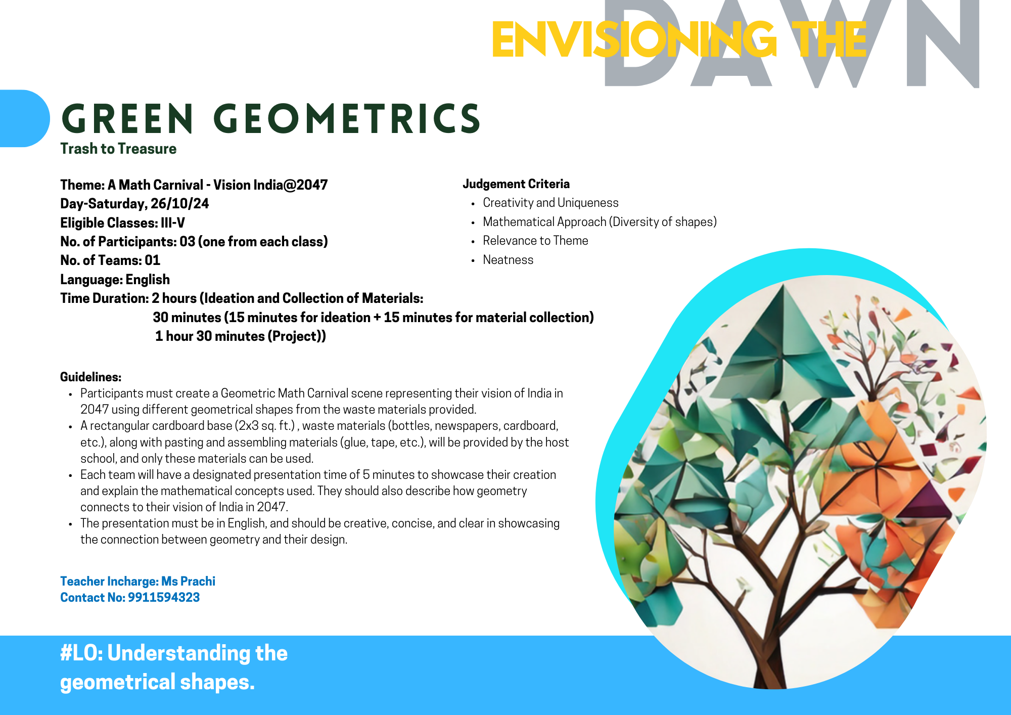 Create a geometric math carnival scene to depict their vision of India in 2047. Use various shapes crafted from provided waste materials to promote creativity and sustainability.