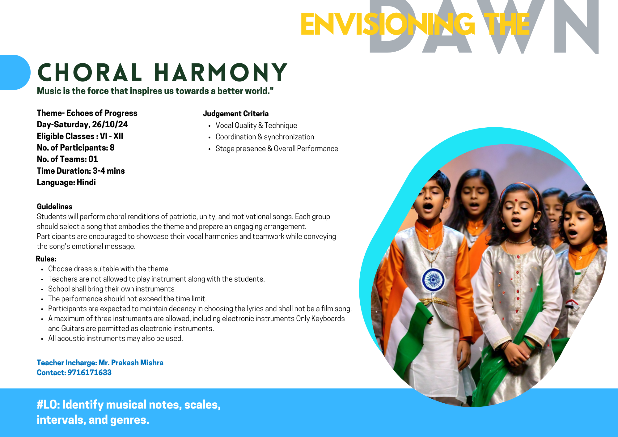Perform patriotic, motivational, and unity songs that celebrate India’s progress and strength. These songs will evoke pride, inspire togetherness, and reflect the nation’s remarkable journey and achievements.