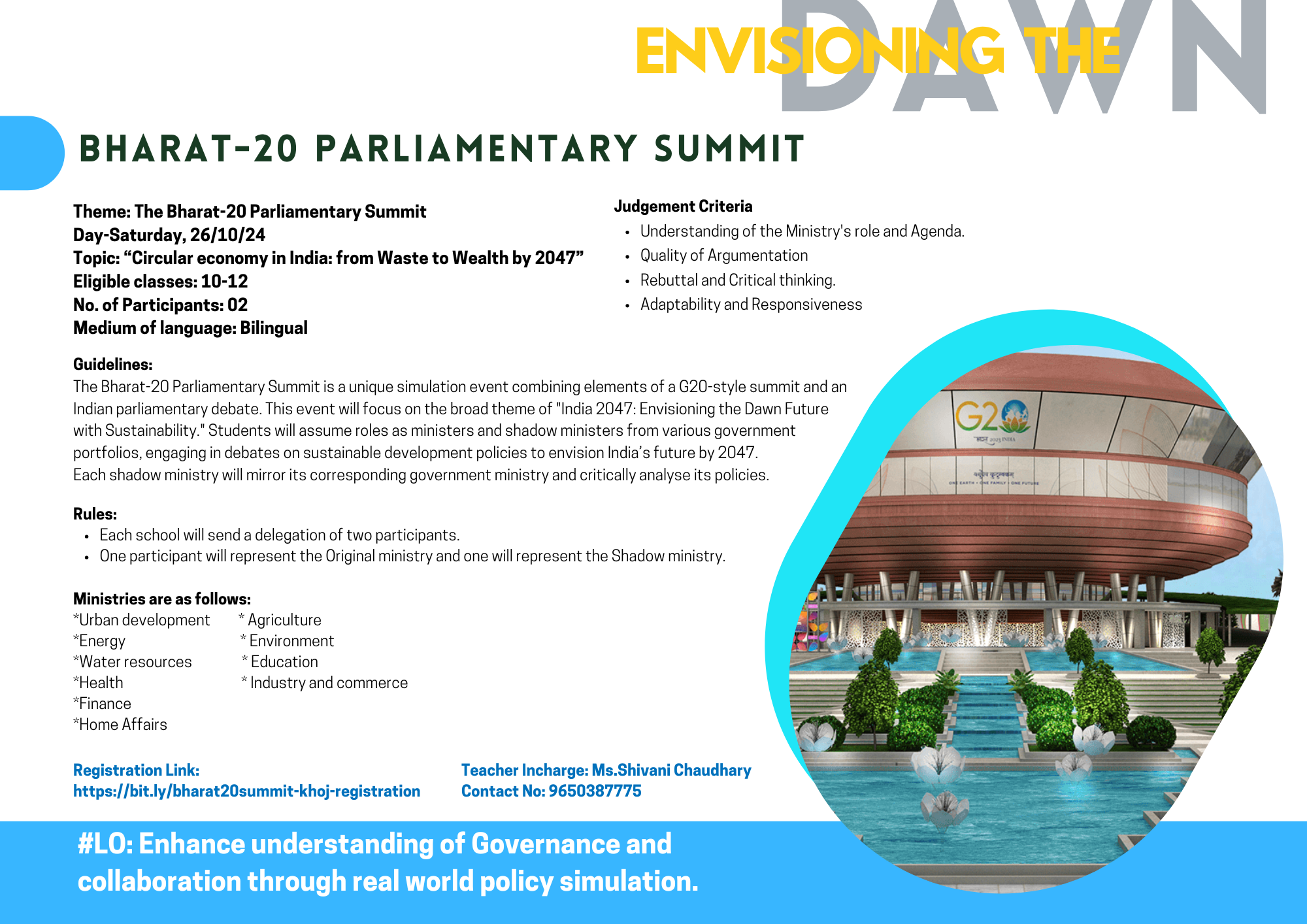 The Bharat-20 Parliamentary Summit simulates a G20-style event where students debate sustainable development policies for India's future by 2047.