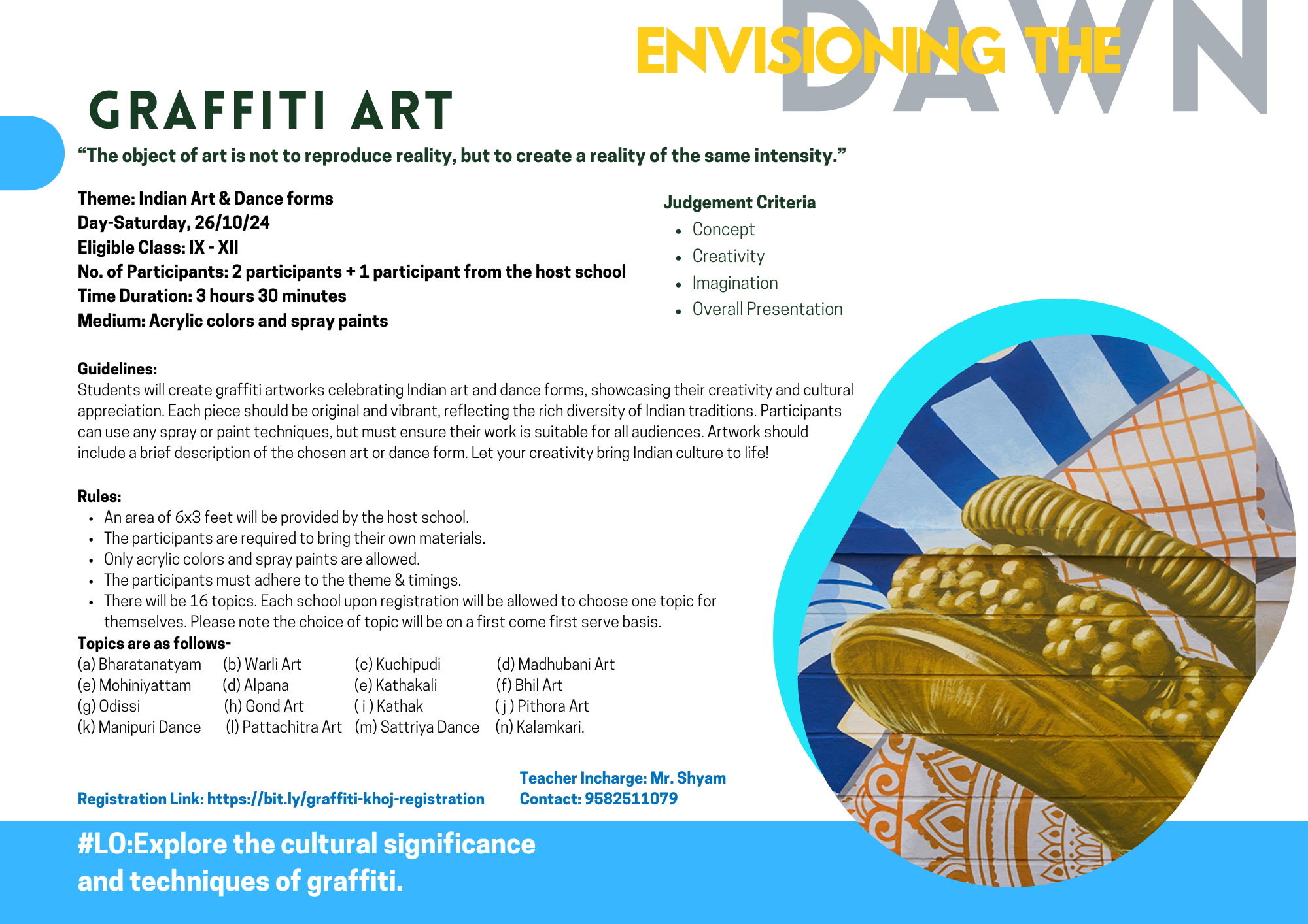 Create graffiti that highlights imagination and creativity through the depiction of Indian art and dance forms.