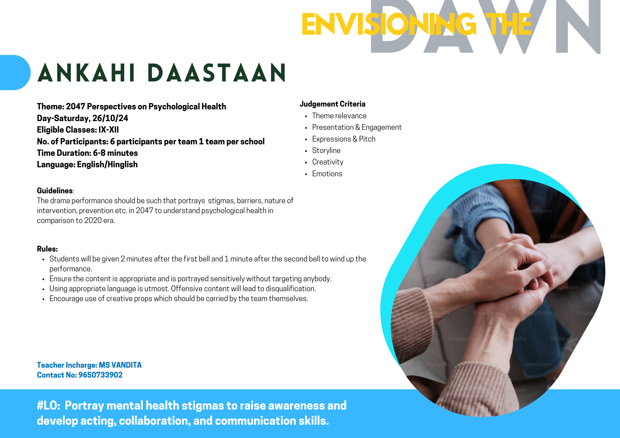 Drama performance to cover stigmas, barriers, nature of intervention, prevention etc. in 2047 to understand psychological health in comparison to the 2020 era.